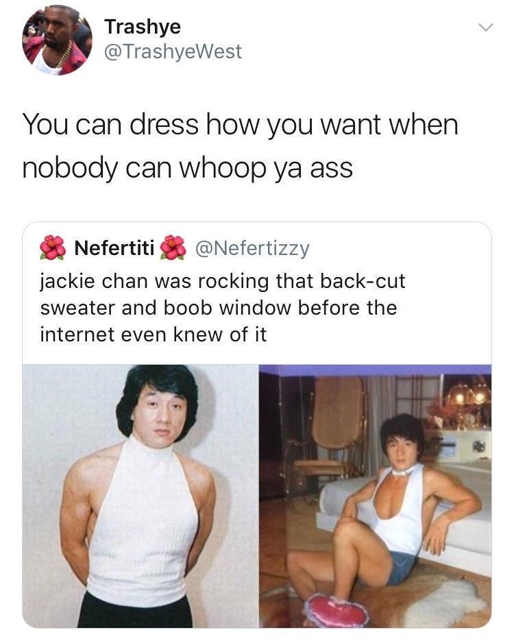 Jackie Chan Was Rocking That Back Cut Sweater And Boob Window